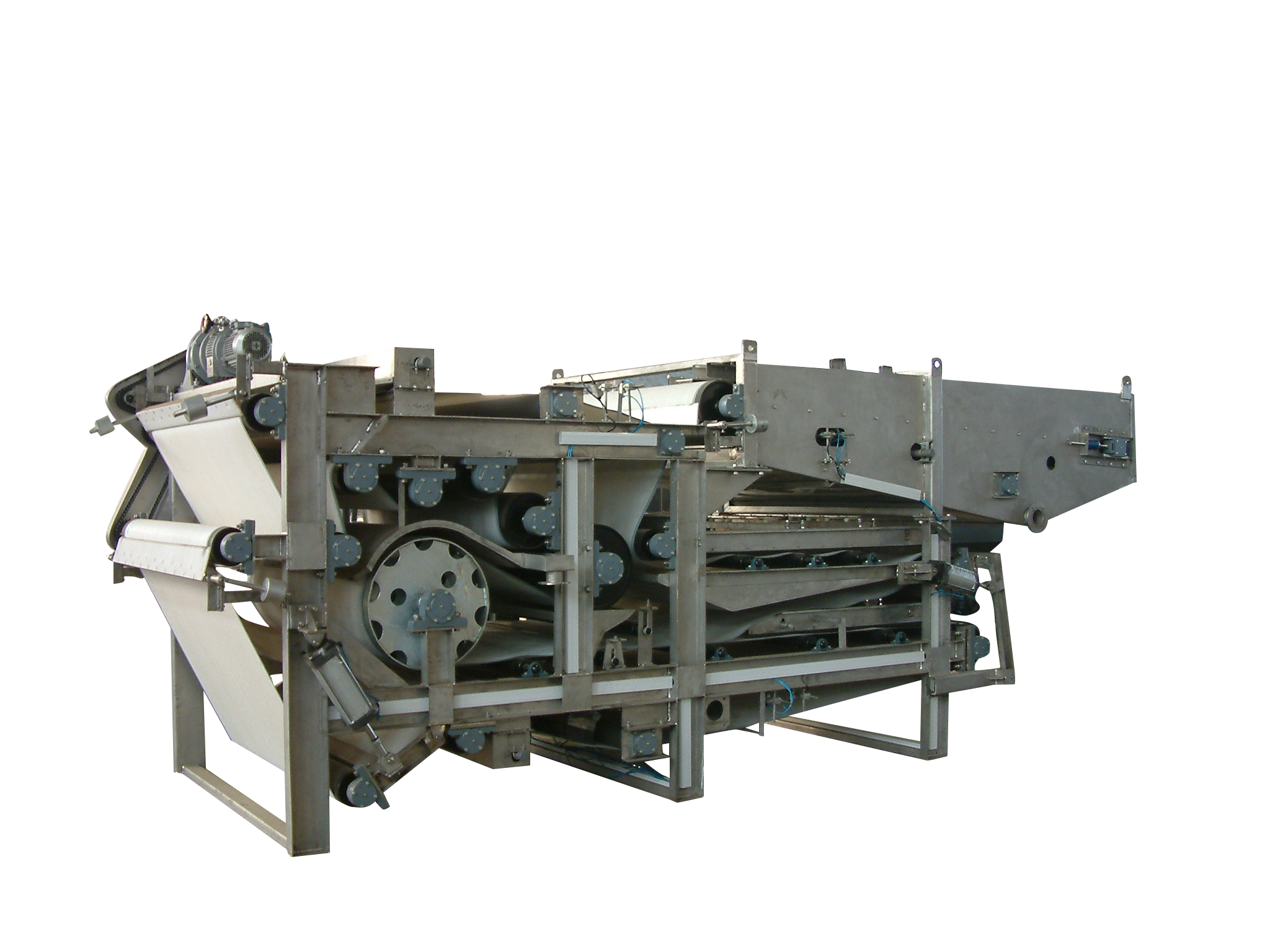 It is designed to process sludge at 1-3% inlet consistency and feeding temperatue of about 20'C. Sludge will reach 15% or higher consistency through various dewatering procedures,including gravit dewatering,wedge dewatering,swing dewatering,shear dewatering. Adapting with a screw will increase up to 38% outlet consistency. This Belt-type thickener is widely applied in sludge handling systems.